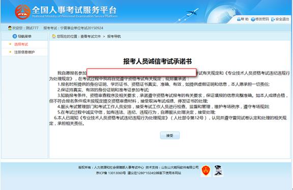 點(diǎn)擊“接受”按鈕,進(jìn)入查看考生承諾書的頁面,如下圖所示: