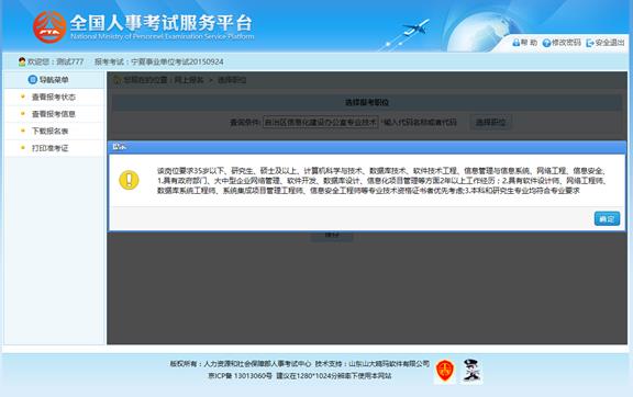 選擇對應(yīng)的職位后,系統(tǒng)會提示報考該職位所需的條件,如下圖所示: