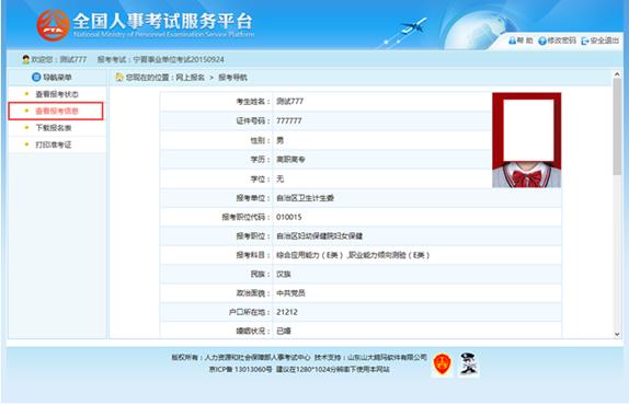 考生可以通過點(diǎn)擊“查看報考信息”按鈕,查看考生填寫的報考信息,如下圖所示: