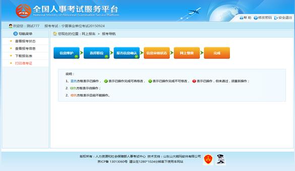 通過點(diǎn)擊“確認(rèn)”按鈕,提示確認(rèn)成功后跳轉(zhuǎn)到報考流程頁面,則完成填報信息操作。如下圖所示: