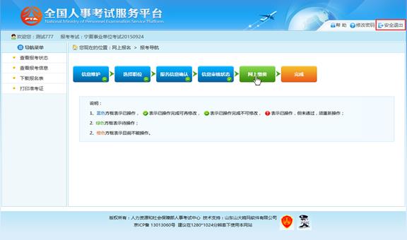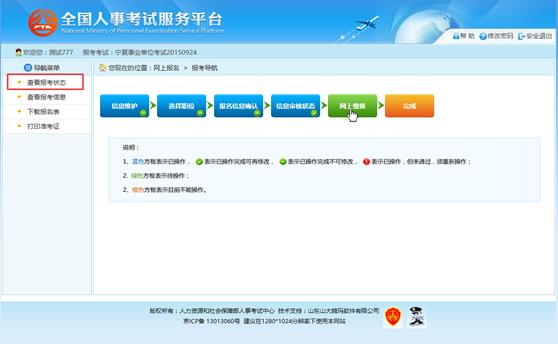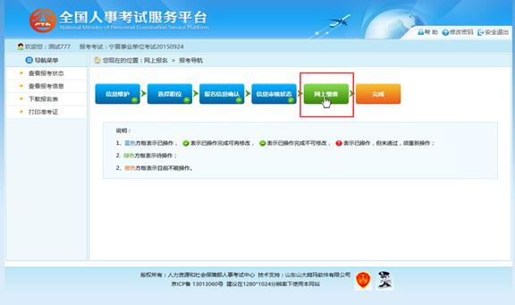 通過審核的考生可以進(jìn)行網(wǎng)上繳費(fèi),點(diǎn)擊報考流程中“網(wǎng)上繳費(fèi)”選項(xiàng),可以進(jìn)入網(wǎng)上繳費(fèi)的頁面,如下圖所示: