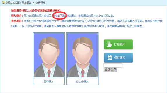 系統(tǒng)只能上傳通過中國人事考試網(wǎng)發(fā)布的照片審核處理工具(http://www.cpta.com.cn/n/2014/0611/c385858-25135705.html)處理后的照片,點(diǎn)擊“打開照片”按鈕選擇要上傳的照片,輸入驗(yàn)證碼,點(diǎn)擊“保存照片”,上傳成功后跳轉(zhuǎn)到照片確認(rèn)頁面,如下圖所示: