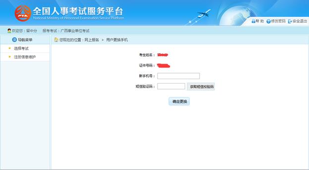 在該頁面可以完成對考生密碼找回及答案信息進(jìn)行修改,也可更換綁定的手機(jī)號。點(diǎn)擊“更換手機(jī)”按鈕,跳轉(zhuǎn)到更換手機(jī)的頁面,通過該頁面可以完成考生綁定手機(jī)號的更換操作。