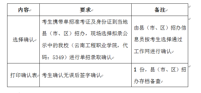 (二)2017年4月5日8時—4月7日18時單招擬錄院校專業(yè)確認(rèn)。云南省招考頻道網(wǎng)上公示擬錄名單中的考生,必須到當(dāng)?shù)乜h(市、區(qū))招辦進(jìn)行簽字確認(rèn),被兩所及以上院校擬錄公示的考生,只能選擇一所院校進(jìn)行簽字確認(rèn)。不參加簽字確認(rèn)的考生視為自動放棄單招錄取。