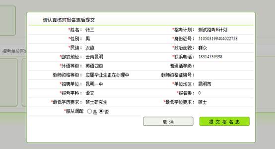 7、點(diǎn)擊報(bào)名,會(huì)彈出確認(rèn)報(bào)名信息的顯示框,請(qǐng)最后確認(rèn)要報(bào)名的崗位信息和個(gè)人資料信息,發(fā)現(xiàn)個(gè)人資料不對(duì)的地方,需要到資料維護(hù)里邊進(jìn)行修改。特別說明:一個(gè)招考計(jì)劃下只能報(bào)一個(gè)崗位。
