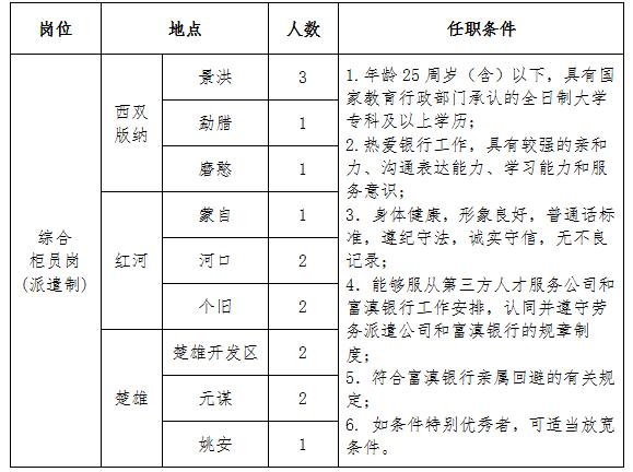 富滇銀行委托第三方人才服務(wù)公司為西雙版納、紅河、楚雄分行選派勞務(wù)派遣人員15人。