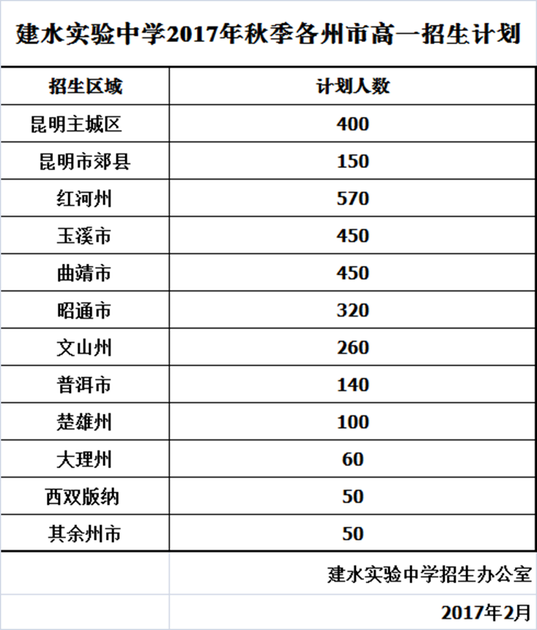 紅河州建水實驗中學(xué)2017年秋季各州市高一招生計劃