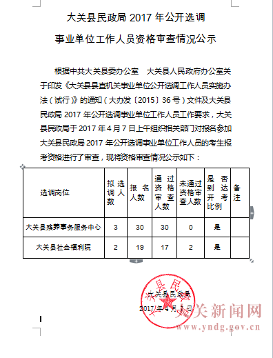 昭通大關(guān)縣民政局2017年選調(diào)事業(yè)單位人員資格審查情況公布