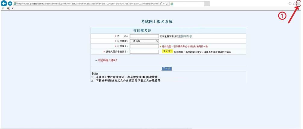 1.進(jìn)入打印準(zhǔn)考證頁(yè)面后,選擇IE瀏覽器菜單中的“工具”菜單項(xiàng),或者點(diǎn)擊如下圖所示的齒輪圖標(biāo)