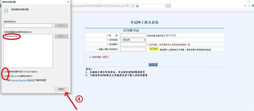4.確認(rèn)”21wecan.com”出現(xiàn)在”已添加到兼容性視圖中的網(wǎng)站”下的方框中,同時(shí)確認(rèn)如下圖的兩個(gè)勾選項(xiàng),點(diǎn)擊”關(guān)閉”即可進(jìn)行打印準(zhǔn)考證操作。