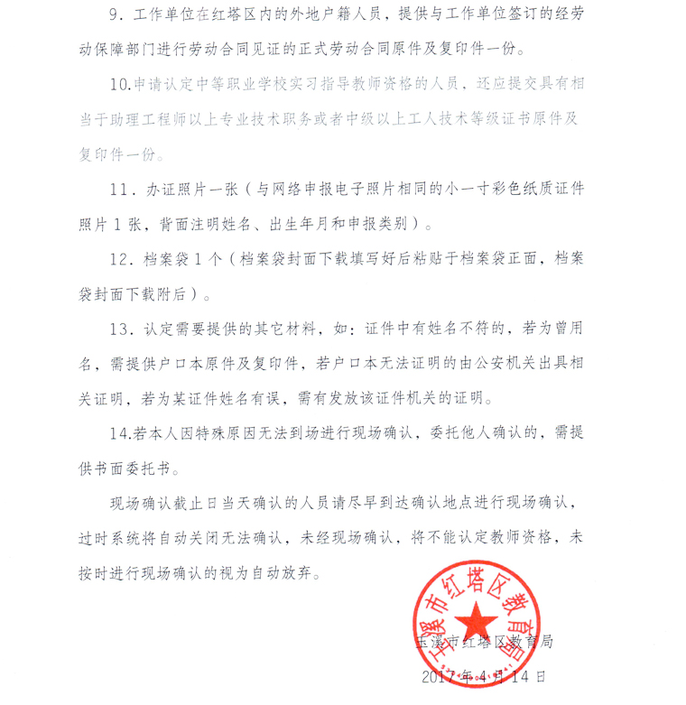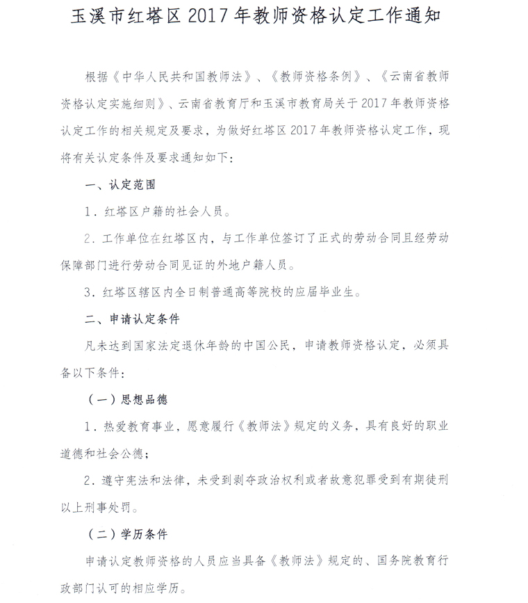 玉溪市紅塔區(qū)2017年教師資格認(rèn)定工作安排通知