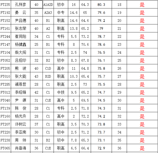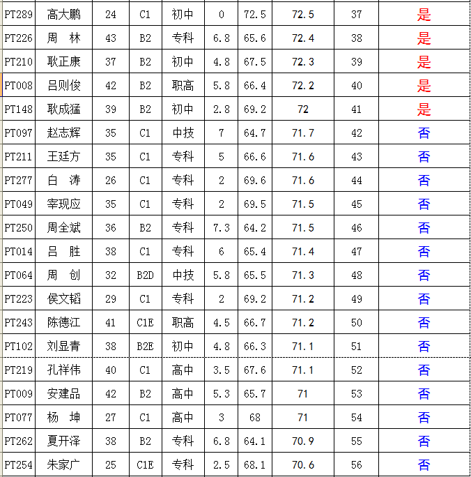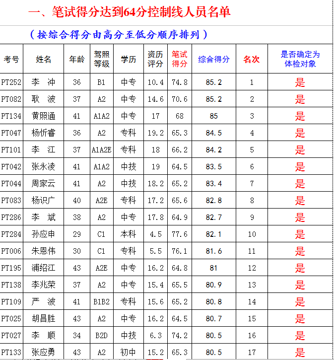 (一)按照《關(guān)于調(diào)整宣威市公務(wù)用車平臺招聘駕駛員工作流程的公告》規(guī)定,對技術(shù)知識測試得分達(dá)到64分及以上的72名考生,納入綜合得分計(jì)算、排名環(huán)節(jié),并按綜合得分由高至低順序確定體檢對象41名(詳見附表)。
