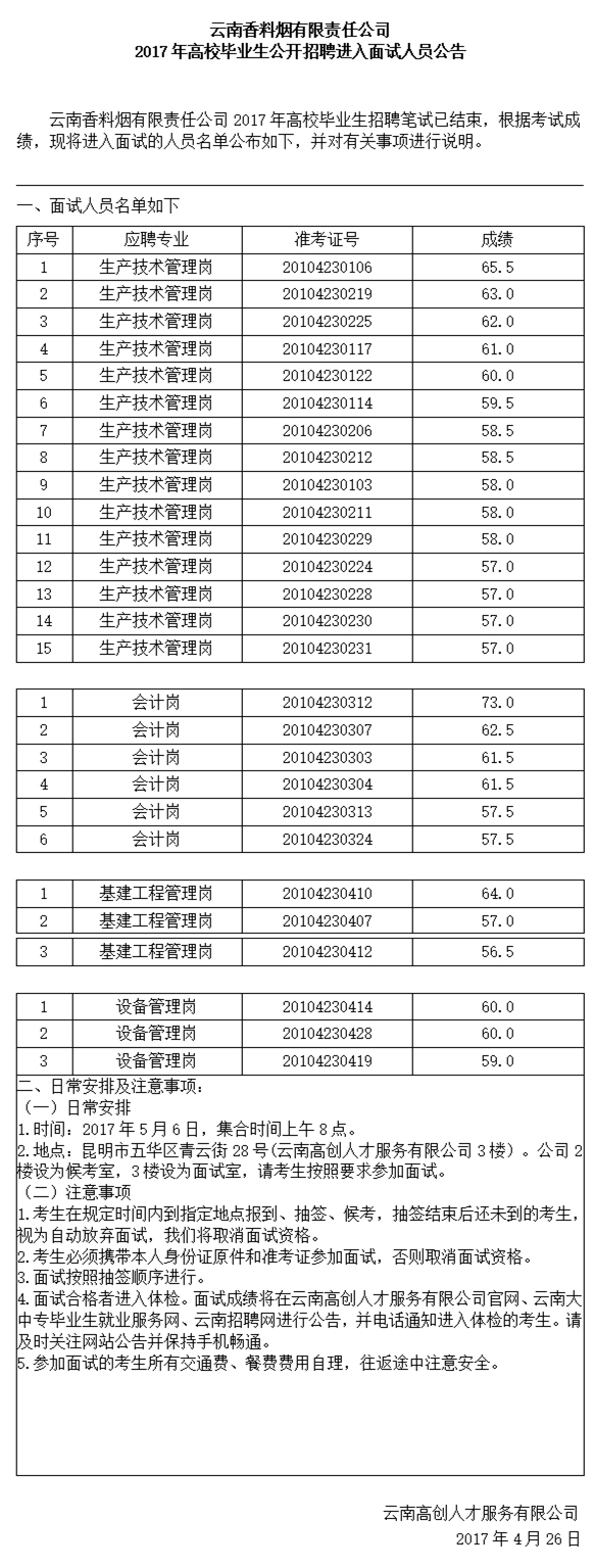 云南香料煙有限責(zé)任公司2017年招聘面試人員公告