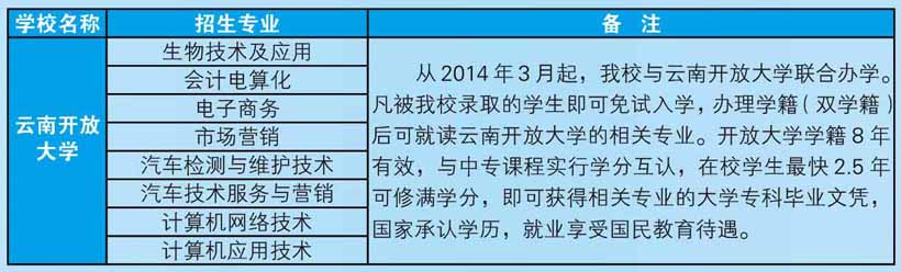 2、云南開(kāi)放大學(xué):凡欲報(bào)讀開(kāi)放大學(xué)的學(xué)生,必須先注冊(cè)為我校的中職學(xué)籍,方可取得云南開(kāi)放大學(xué)學(xué)籍。就讀開(kāi)放大學(xué)的專(zhuān)業(yè)需要與我校中職就讀專(zhuān)業(yè)相同或相近,不得跨專(zhuān)業(yè)報(bào)讀。