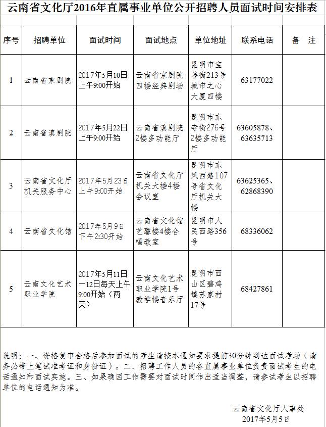 云南省文化廳2016年直屬事業(yè)單位招聘人員面試時(shí)間安排表