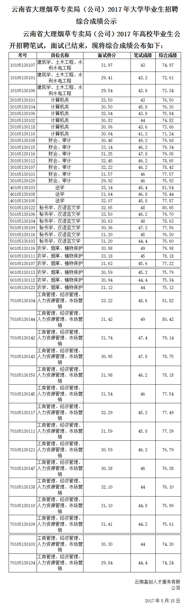 云南省大理煙草專賣局2017年招聘綜合成績公示