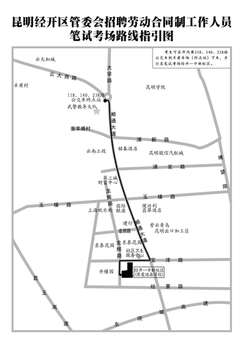 筆試地點在經(jīng)開區(qū)第一中學(xué)新校區(qū)(原愛迪生學(xué)校),地址:昆明市出口加工區(qū)龍輝路丹槿園小區(qū)對面。市內(nèi)可乘118、140、238路公交車至羊甫車場下車,沿順通大道往第三城方向前行1.5公里至寶澤路右轉(zhuǎn)至丹槿園小區(qū)旁即到。