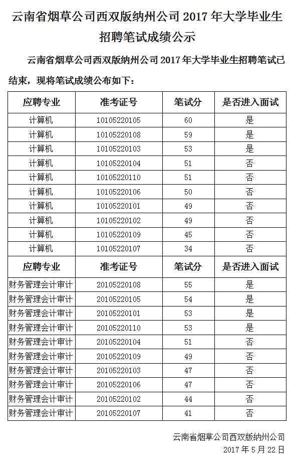 云南省煙草公司西雙版納州公司2017年筆試成績公示