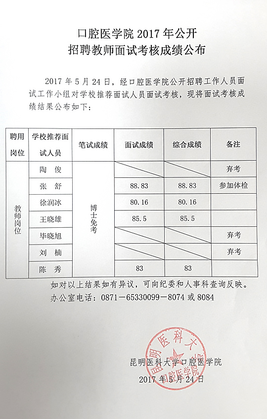 云南省口腔醫(yī)學院2017年招聘教師面試考試成績公布