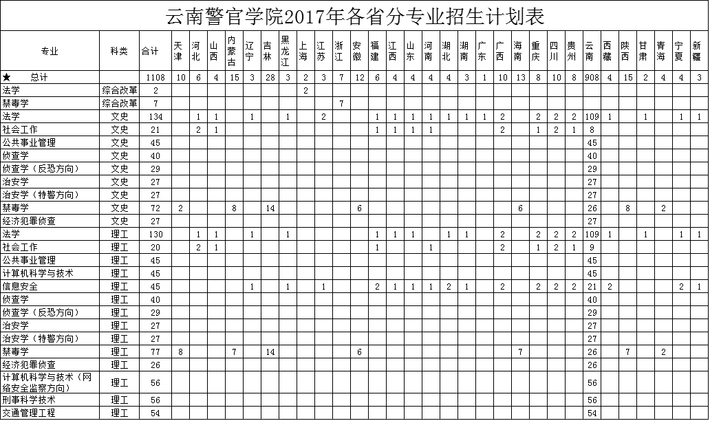 云南警官學院2017年各省分專業(yè)招生計劃表