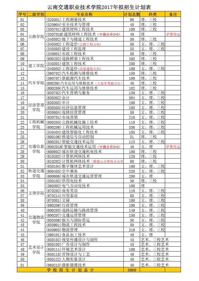 云南交通職業(yè)技術學院2017年擬招生計劃表