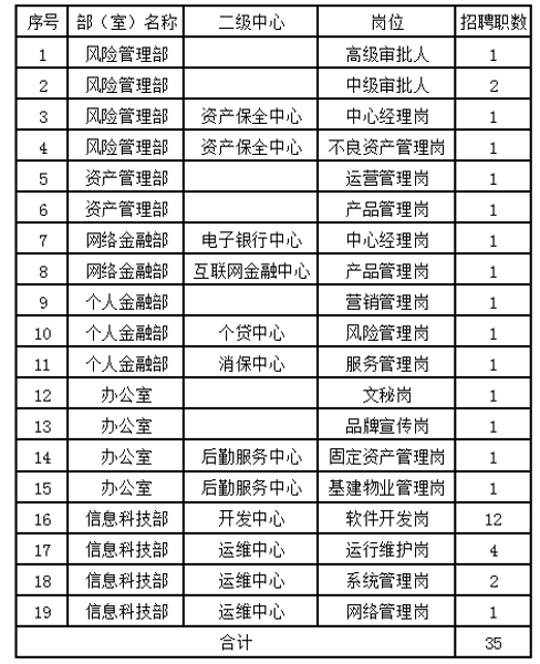 1.應聘風險管理部高級審批人、中級審批人、資產(chǎn)保全中心中心經(jīng)理崗以及網(wǎng)絡金融部電子銀行中心中心經(jīng)理崗位的要求1972年1月1日之后出生(45周歲及以下),應聘其它崗位的要求1982年1月1日之后出生(35周歲及以下)。