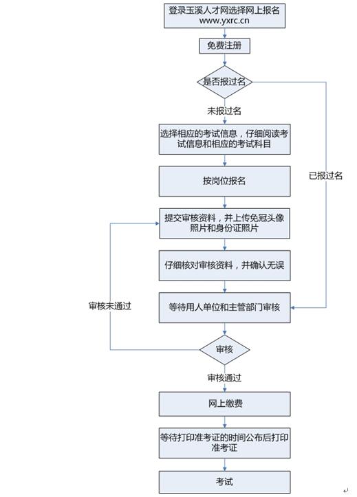 網(wǎng)絡(luò)報名的大致流程為:登錄玉溪人才網(wǎng)→網(wǎng)上報名入口→注冊→查看招聘崗位→按崗位報名并填寫報名資料→等待審核→審核通過→網(wǎng)上交費(注意查看交費狀態(tài),確認(rèn)交費成功)→打印筆試準(zhǔn)考證(打印時間在筆試公告內(nèi)另行通知)→參加筆試。