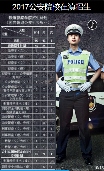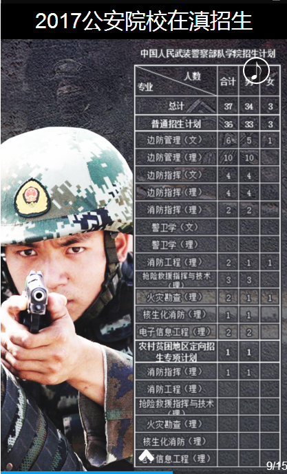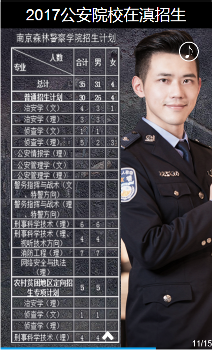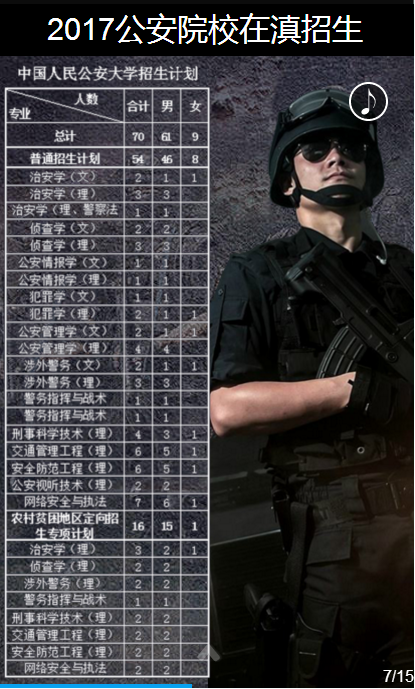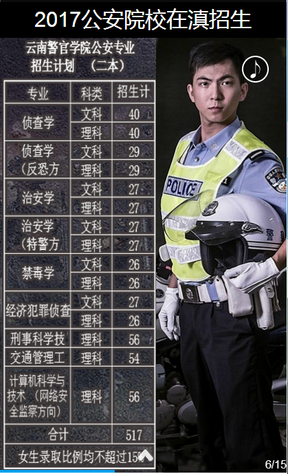 (二)6所省外公安(現(xiàn)役)院校面向全省擇優(yōu)錄取;云南警官學(xué)院本科9個(gè)公安專(zhuān)業(yè)招生計(jì)劃分配到相關(guān)州、市擇優(yōu)錄?。簧鲜鲈盒E浫”壤怀^(guò)15%。