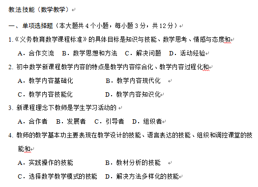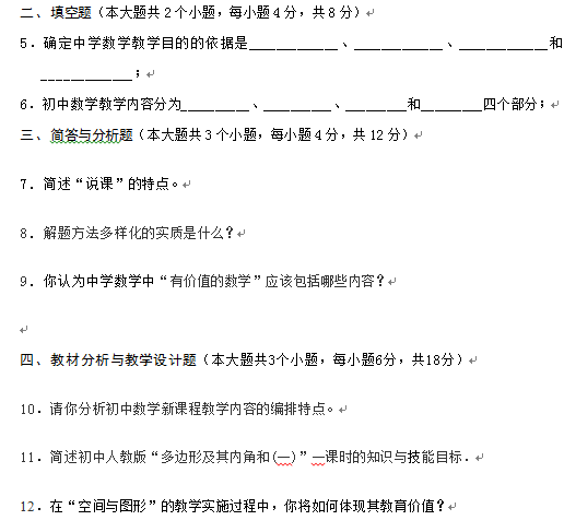 試題類型:“專業(yè)知識(shí)”的題型為單項(xiàng)選擇題、填空題、解答題;“教法技能”的題型為單項(xiàng)選擇題、填空題、簡(jiǎn)答與分析題、教材分析與教學(xué)設(shè)計(jì)題。