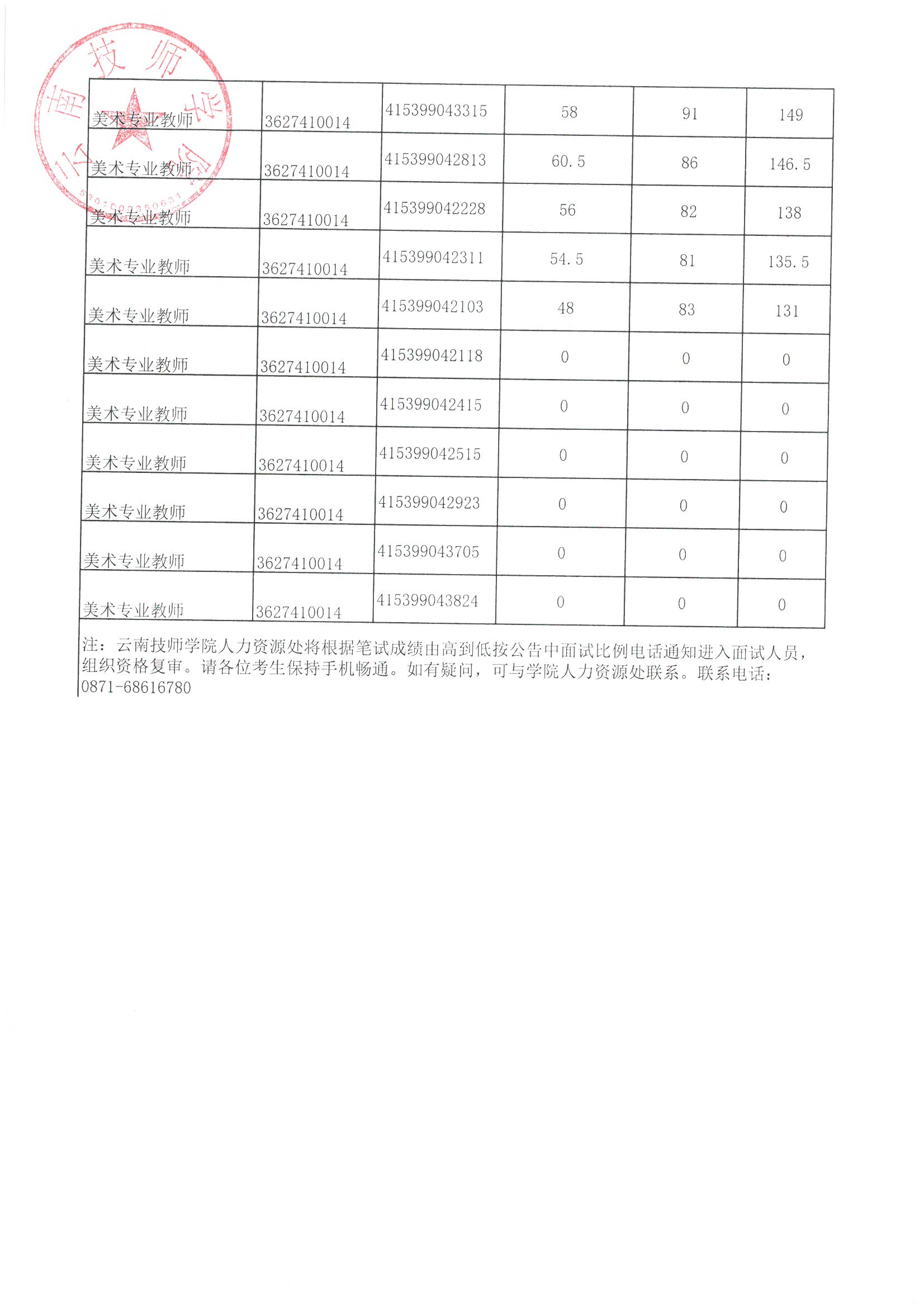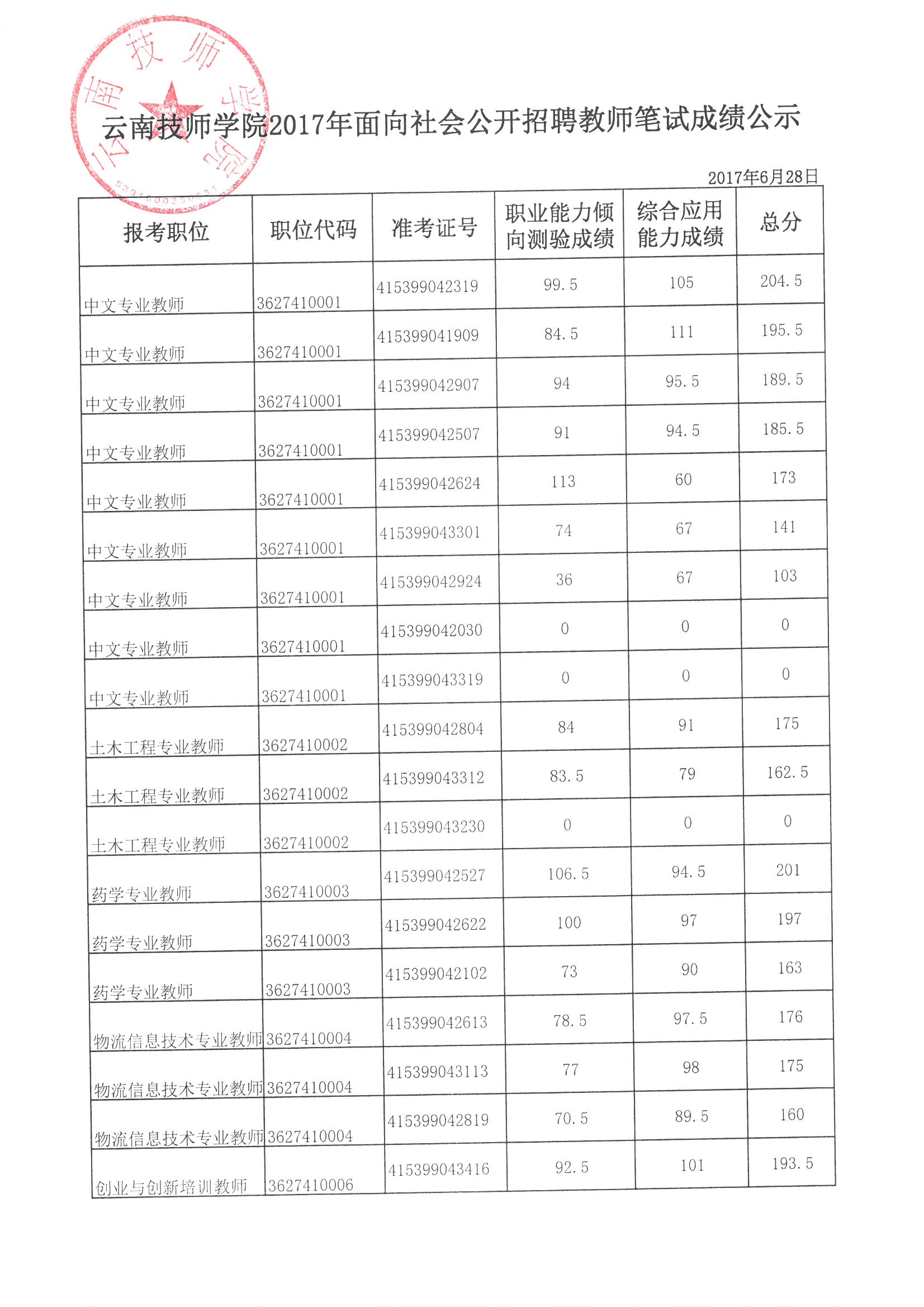 云南技師學(xué)院2017年招聘教師筆試成績(jī)公示