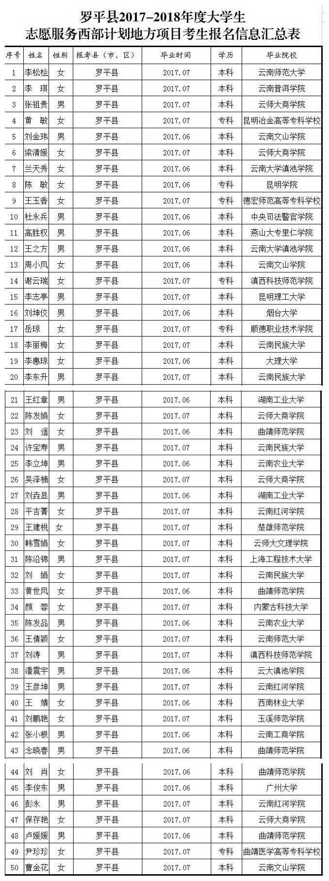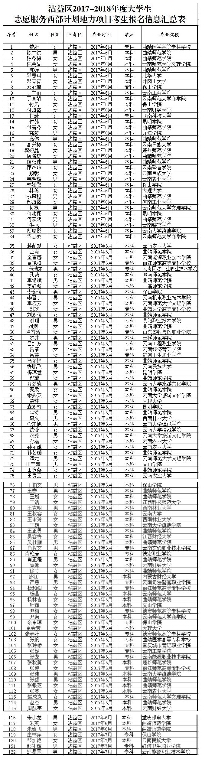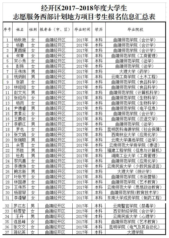 附件:曲靖市2017-2018年度大學(xué)生西部計(jì)劃地方項(xiàng)目考生筆試詳細(xì)名單