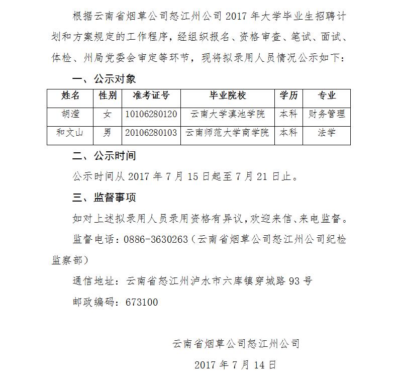 云南省煙草公司怒江州公司2017年招聘擬錄公示