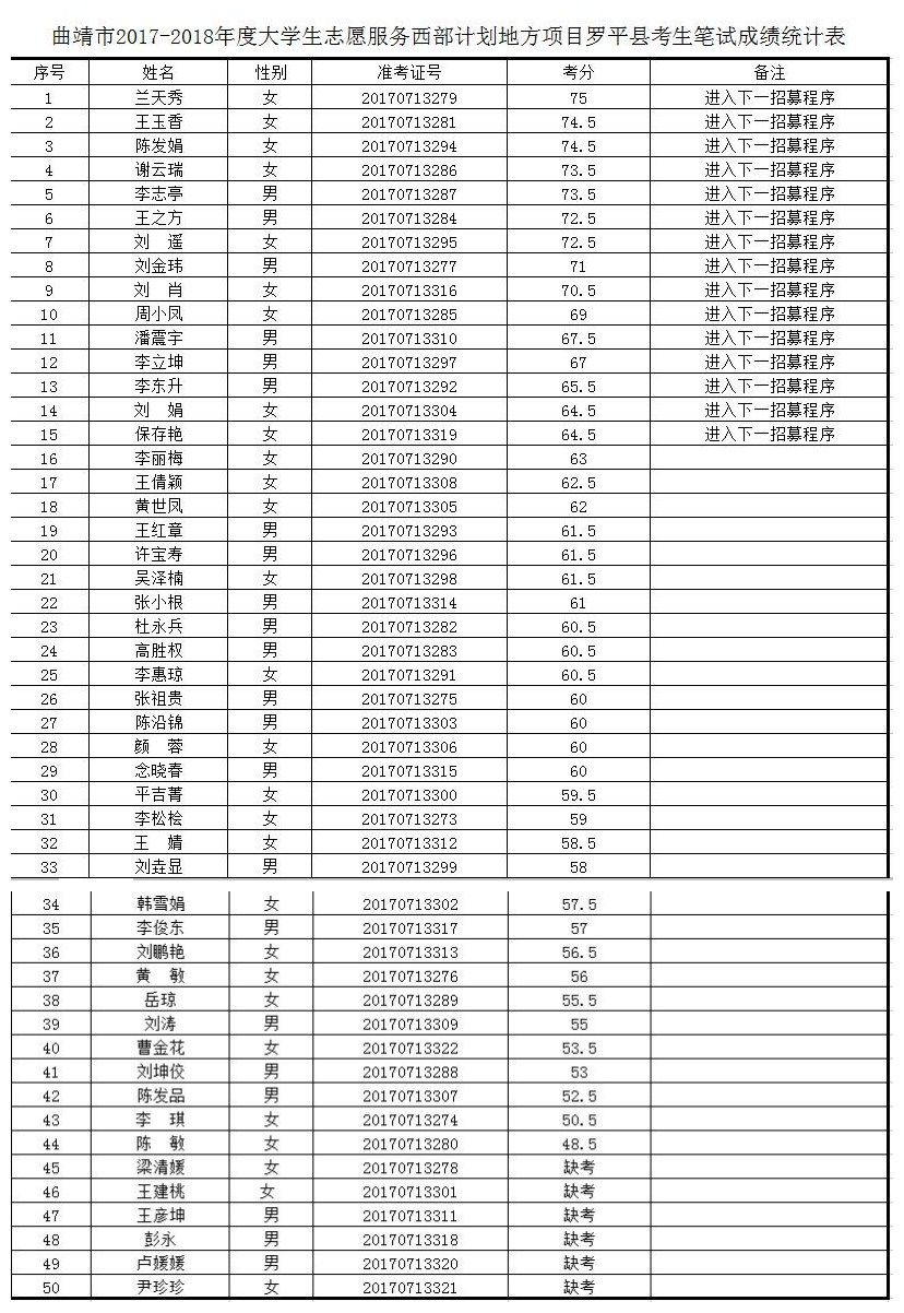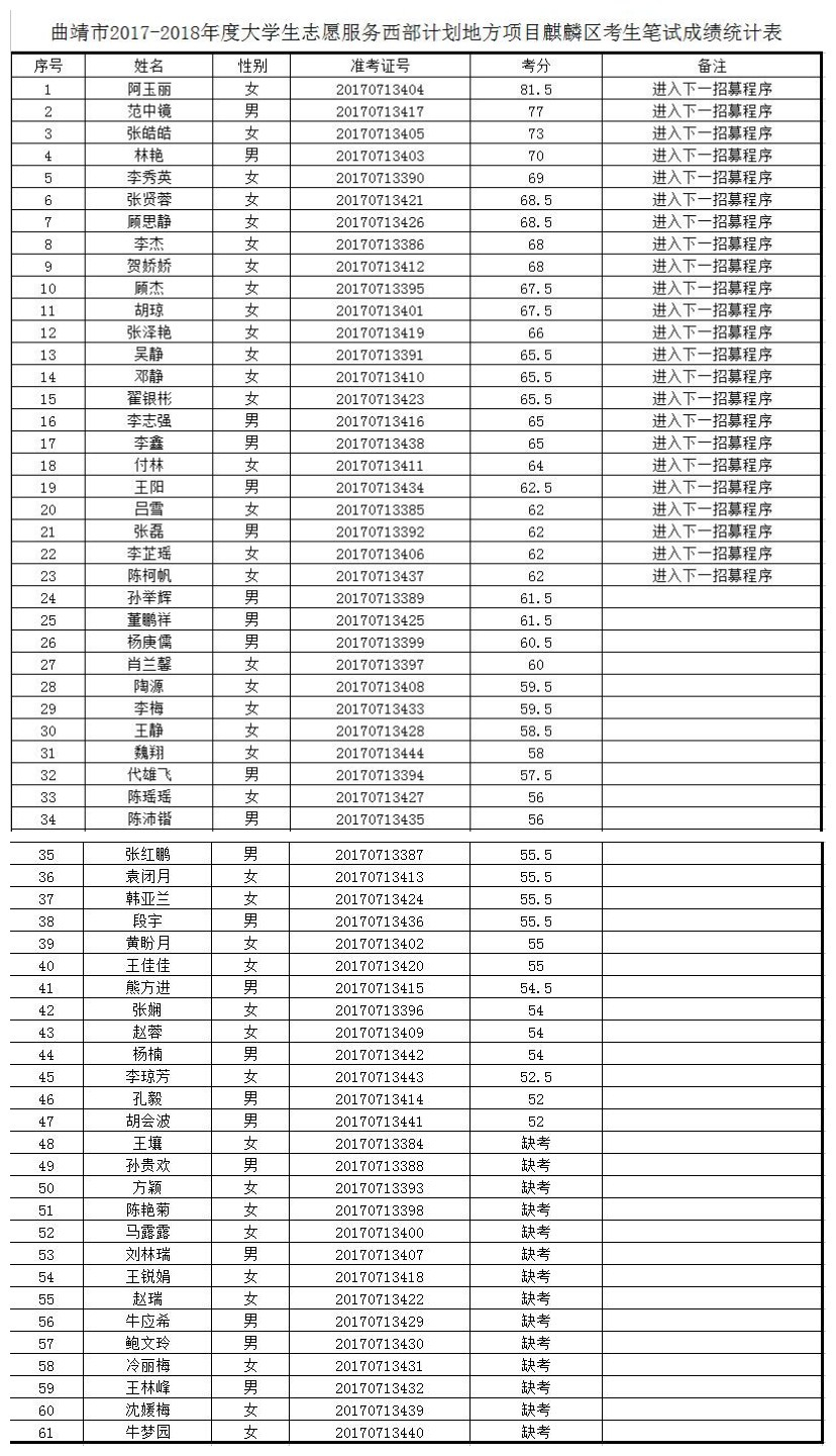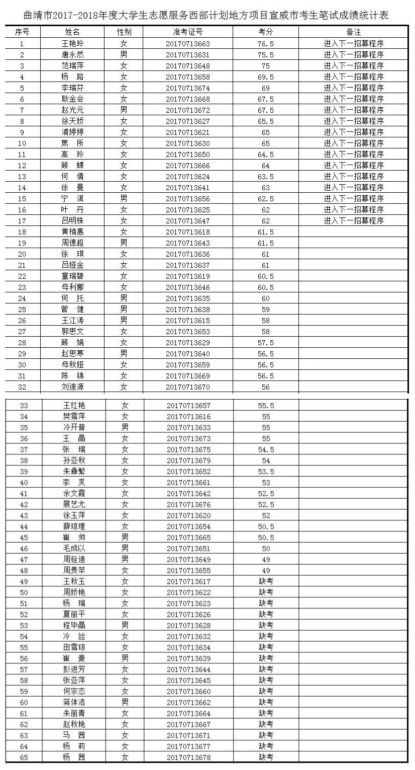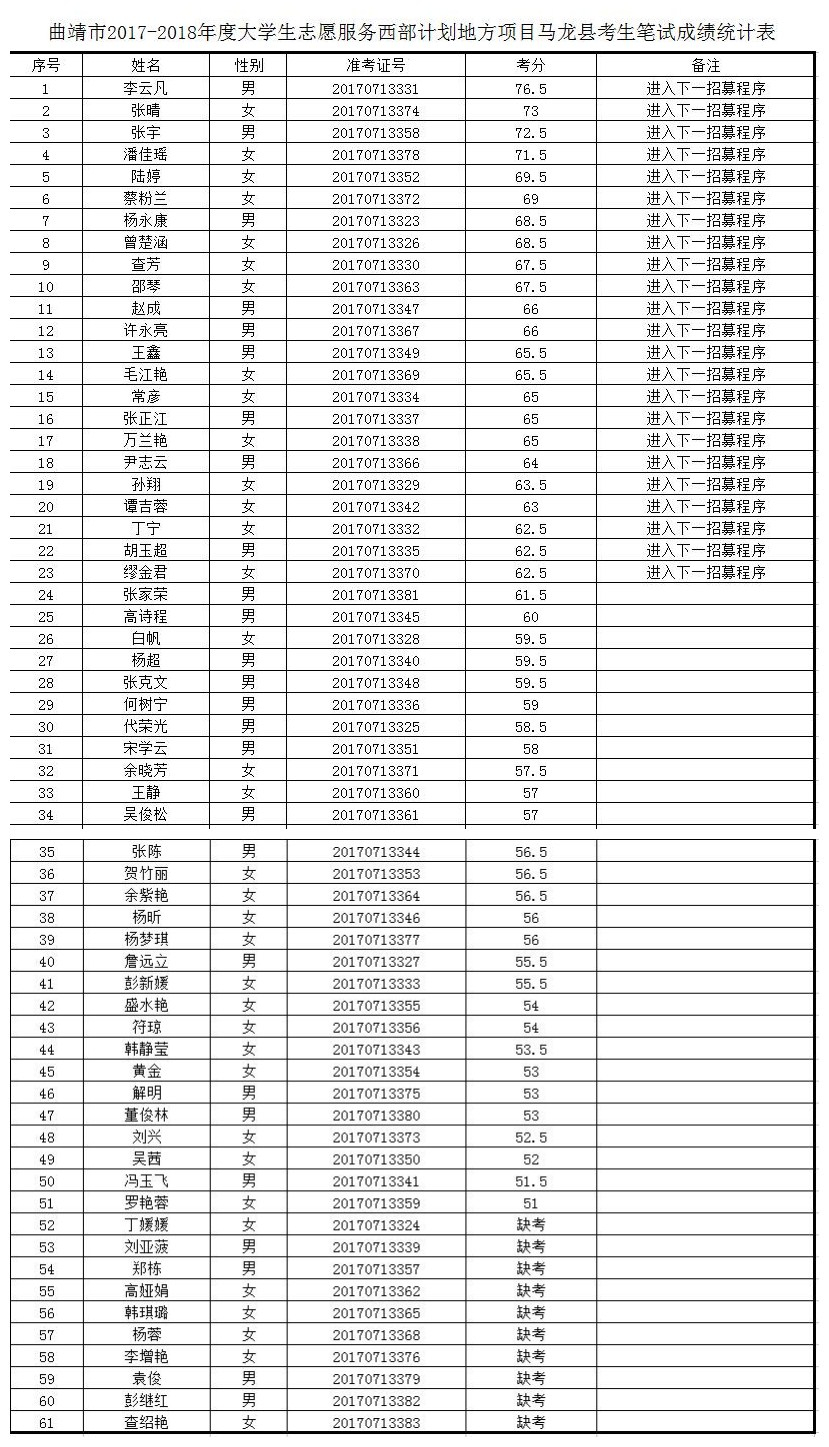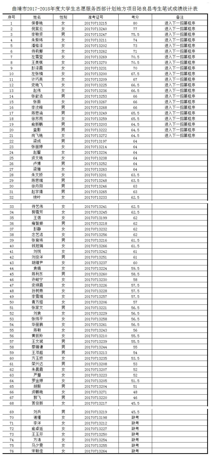 根據(jù)曲靖市2017-2018年度大學(xué)生志愿服務(wù)西部計(jì)劃省級(jí)地方項(xiàng)目志愿者招募程序, 此次招考共801人報(bào)名參加,其中應(yīng)考678人,缺考123人。曲靖市2017—2018年度大學(xué)生志愿服務(wù)西部計(jì)劃省級(jí)地方項(xiàng)目招募名額為100名,其中:麒麟?yún)^(qū)10人,宣威市8人,沾益區(qū)11人,馬龍縣11人,陸良縣10人,師宗縣10人,富源縣11人,羅平縣7人,會(huì)澤縣12人,經(jīng)開(kāi)區(qū)10人。本次筆試成績(jī)根據(jù)招募崗位(以縣〈市〉為單位)1︰2的比例,按照筆試成績(jī)從高到低確定進(jìn)入下一招募程序名單?,F(xiàn)將志愿者招募筆試成績(jī)公告如下。