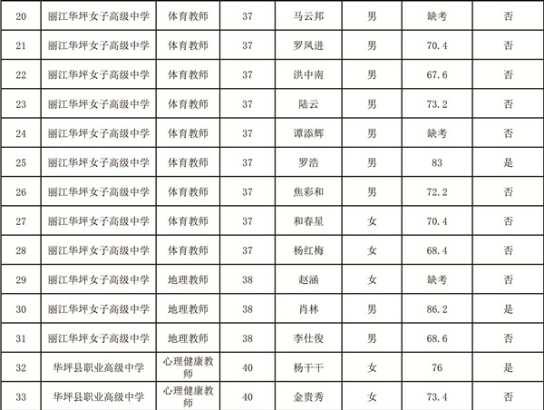 2017年7月17日麗江華坪女子高級中學縣職業(yè)高級中學公開招聘工作人員面試工作已經(jīng)結(jié)束,現(xiàn)將此次公開招聘面試成績公示(公示期為七天:2017年7月18日至7月24日)如下: