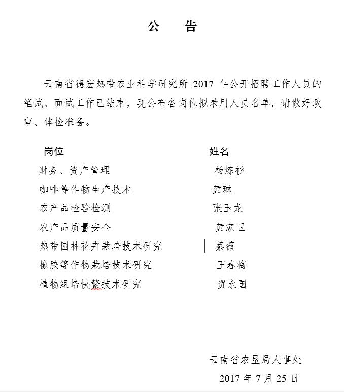 云南省德宏熱帶農業(yè)科學研究所2017年招聘擬錄名單