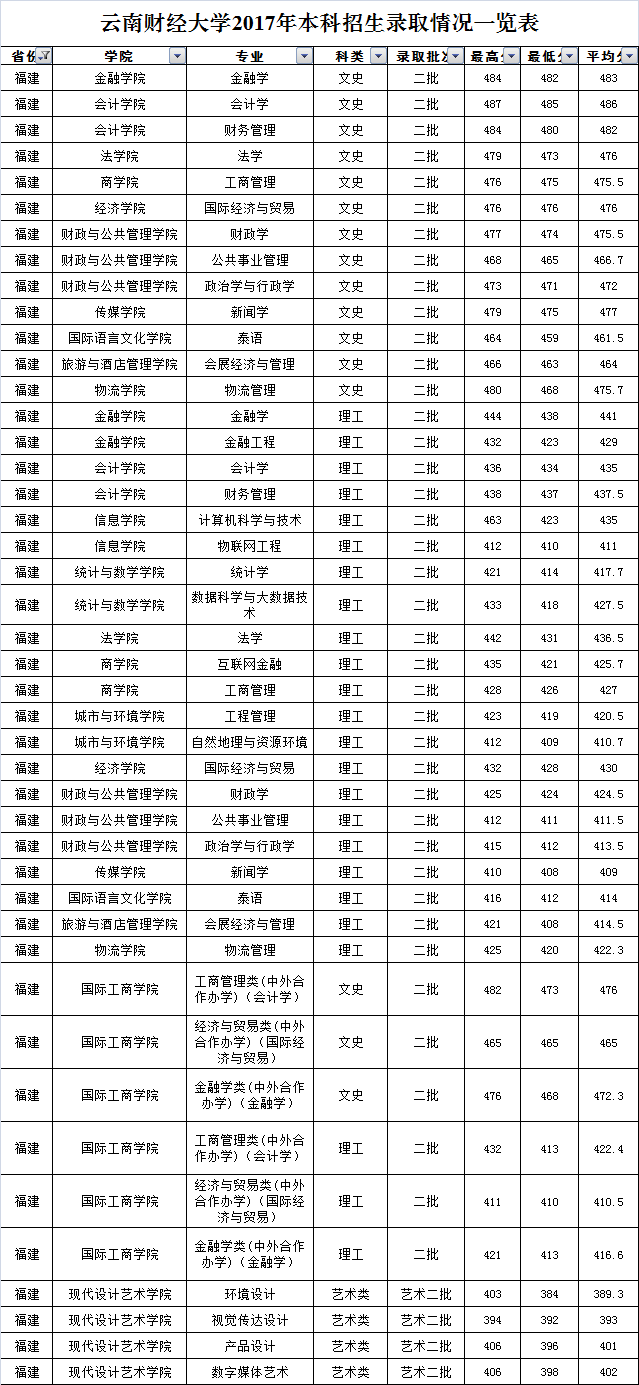 云南財經(jīng)大學2017年福建省錄取情況一覽表