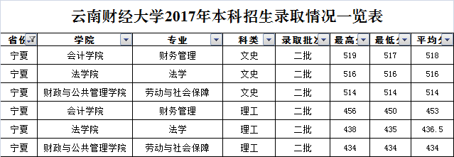 云南財經(jīng)大學(xué)2017年寧夏回族自治區(qū)錄取情況一覽表