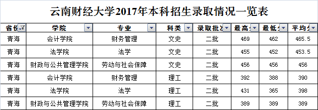 云南財(cái)經(jīng)大學(xué)2017年青海省錄取情況一覽表