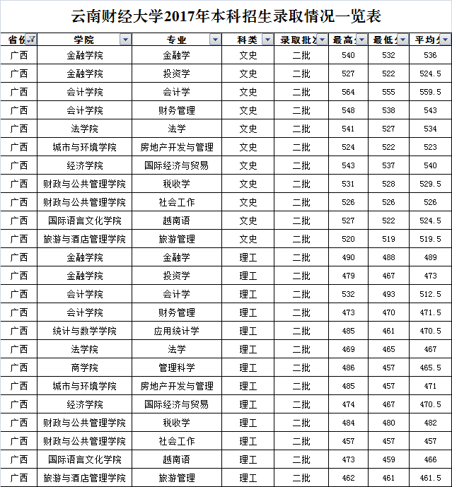 云南財經(jīng)大學2017年廣西省錄取情況一覽表