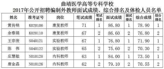 根據(jù)《曲靖醫(yī)學(xué)高等專科學(xué)校2017年事業(yè)單位公開招聘編制外教師公告》要求,現(xiàn)將本次招聘面試成績(jī)、綜合成績(jī)排名及體檢人員名單公告如下:
