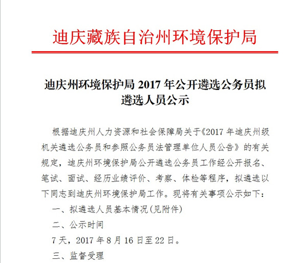 迪慶州環(huán)境保護局2017年公開遴選公務員擬遴選人員公示
