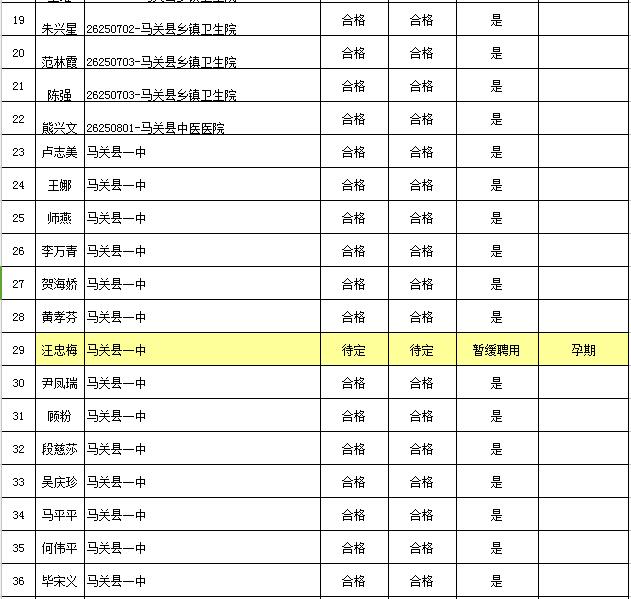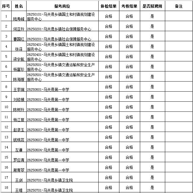 根據(jù)《2017年文山州事業(yè)單位公開招聘工作人員公告》《馬關(guān)縣2017年度事業(yè)單位公開招聘緊缺人才公告》的規(guī)定,現(xiàn)將2017年馬關(guān)縣事業(yè)單位公開招聘、緊缺人才招聘體檢、考核結(jié)果及擬聘用人員名單公告如下,公示期5天。公示期內(nèi),若對擬聘用人員有異議的,請攜帶本人身份證和投訴舉報(bào)書面材料向馬關(guān)縣紀(jì)委監(jiān)察局(電話:0876-7122342)進(jìn)行現(xiàn)場實(shí)名制舉報(bào)(不受理電話舉報(bào)和網(wǎng)絡(luò)舉報(bào)),逾期不予受理。對被舉報(bào)人員進(jìn)行復(fù)核不符合條件和資格的,取消聘用資格。