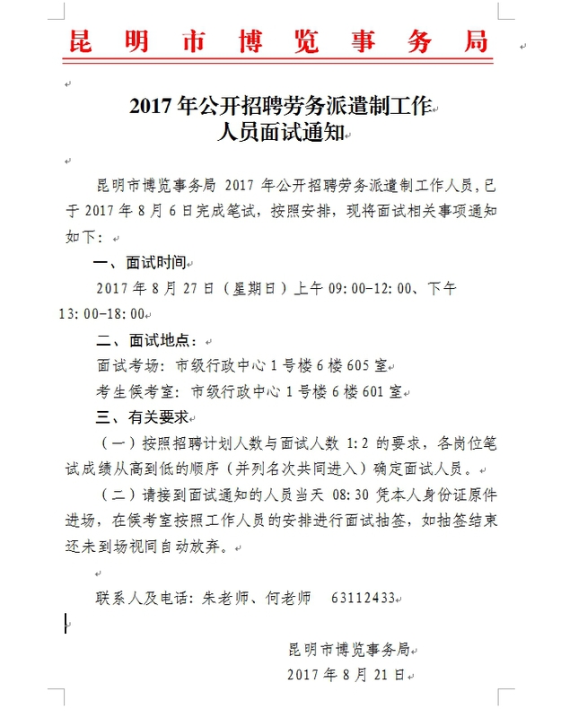 昆明市博覽事務(wù)局2017年招聘勞務(wù)派遣制工作人員面試通知