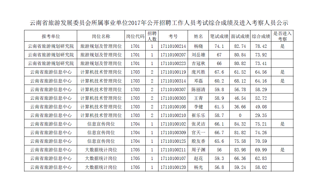 2017年公開招聘工作人員考試綜合成績(jī)及進(jìn)入考察人員公示