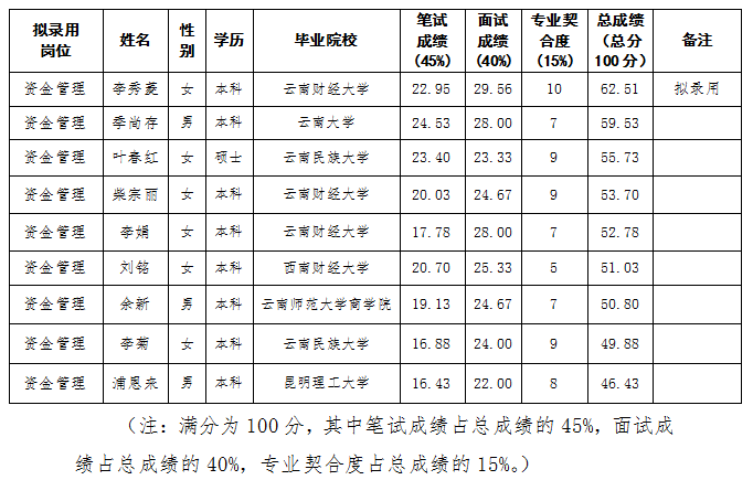 根據(jù)工作需要,綜合筆面試成績(jī)及排名,現(xiàn)對(duì)擬錄用人員進(jìn)行公示。如對(duì)擬錄用人員有異議,請(qǐng)及時(shí)向昆明軌道交通集團(tuán)有限公司紀(jì)檢監(jiān)察室反映。
