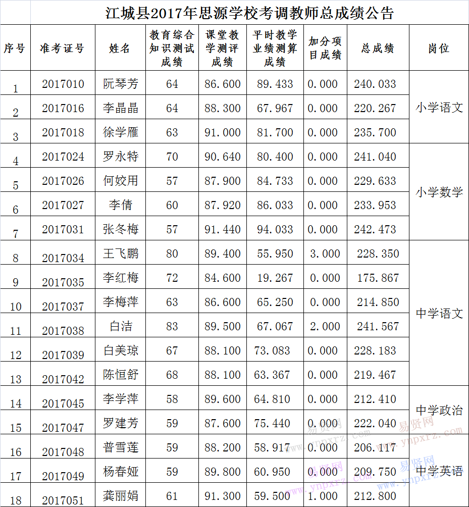 普洱市江城縣2017年思源學(xué)??颊{(diào)教師總成績公告