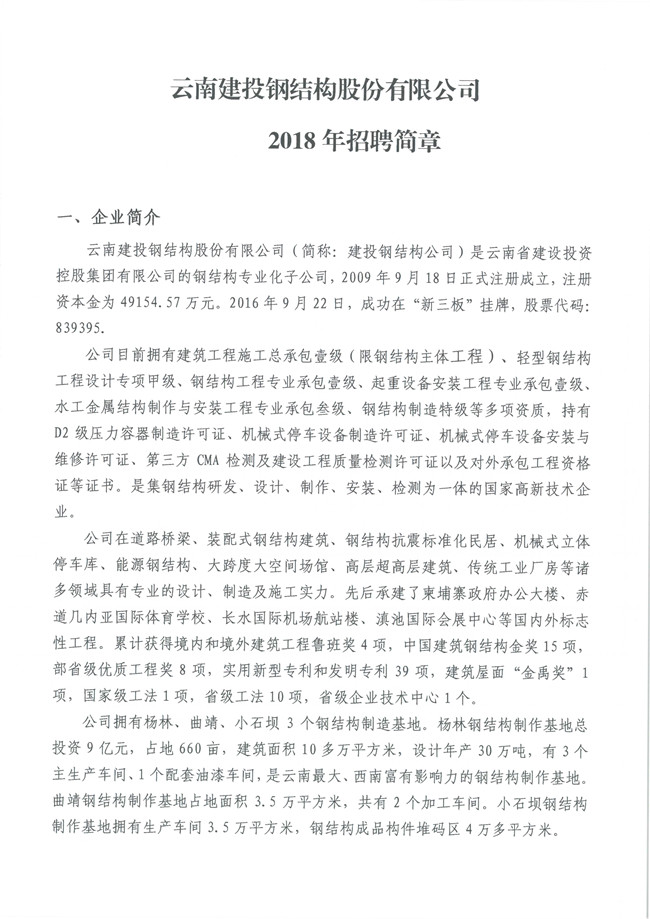 云南建投鋼結(jié)構(gòu)股份有限公司2018年招聘簡章