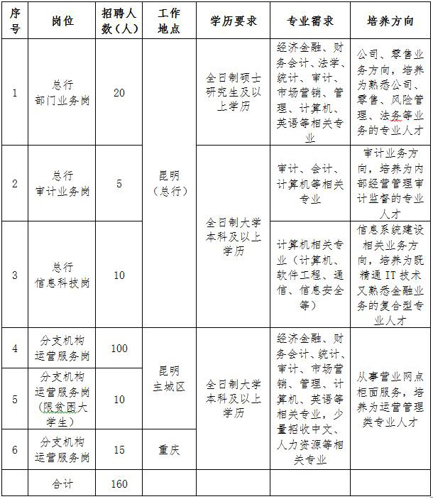 注:為幫助應屆畢業(yè)生更快熟悉掌握富滇銀行業(yè)務、產(chǎn)品和流程,原則上我們將安排錄用至總行部門業(yè)務崗、審計業(yè)務崗、信息科技崗的應屆畢業(yè)生到分支機構(gòu)鍛煉,鍛煉期滿(總行部門業(yè)務崗2年、審計業(yè)務崗1年、信息科技崗3-6個月),考核合格后安排到總行相關(guān)部門工作。