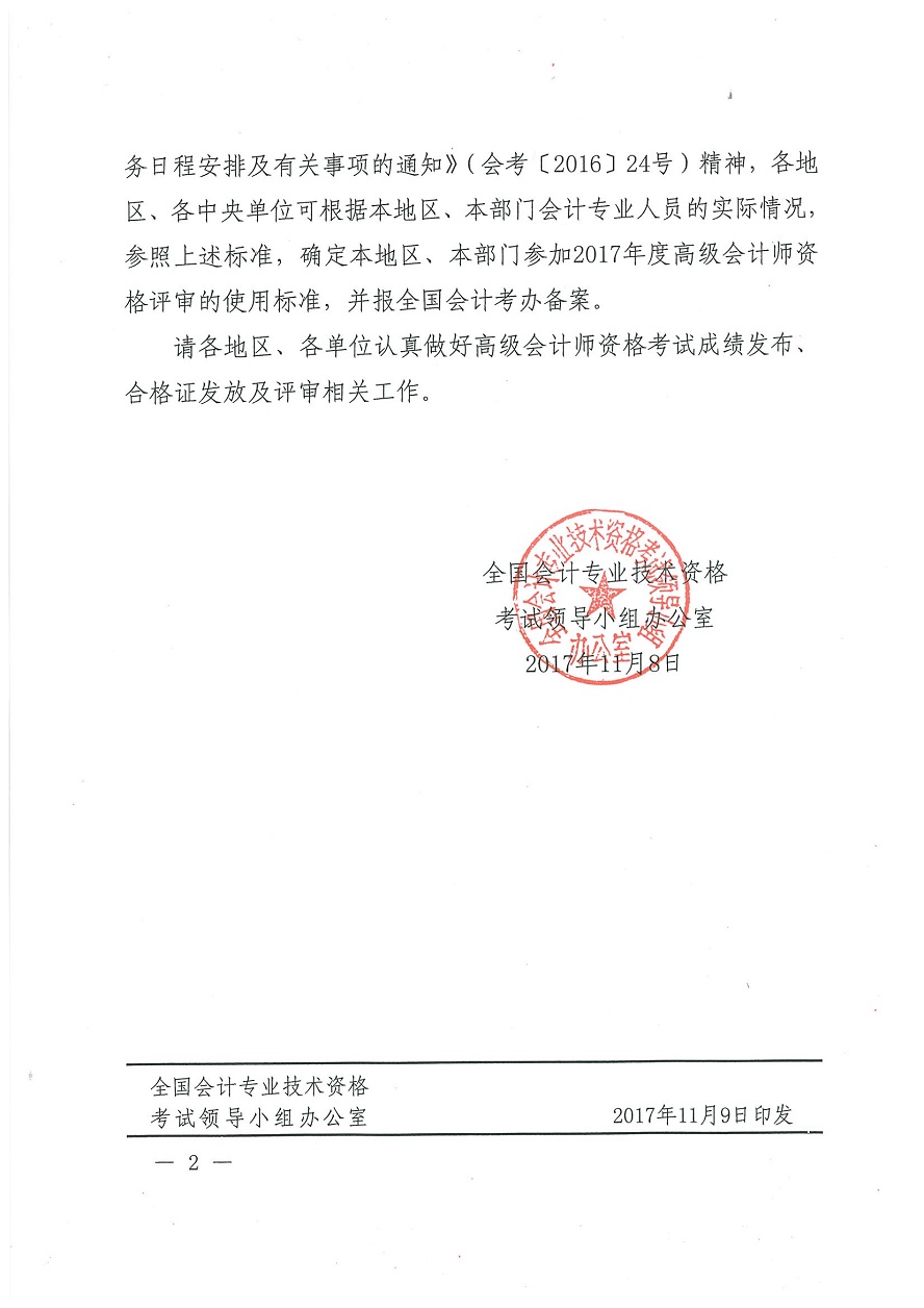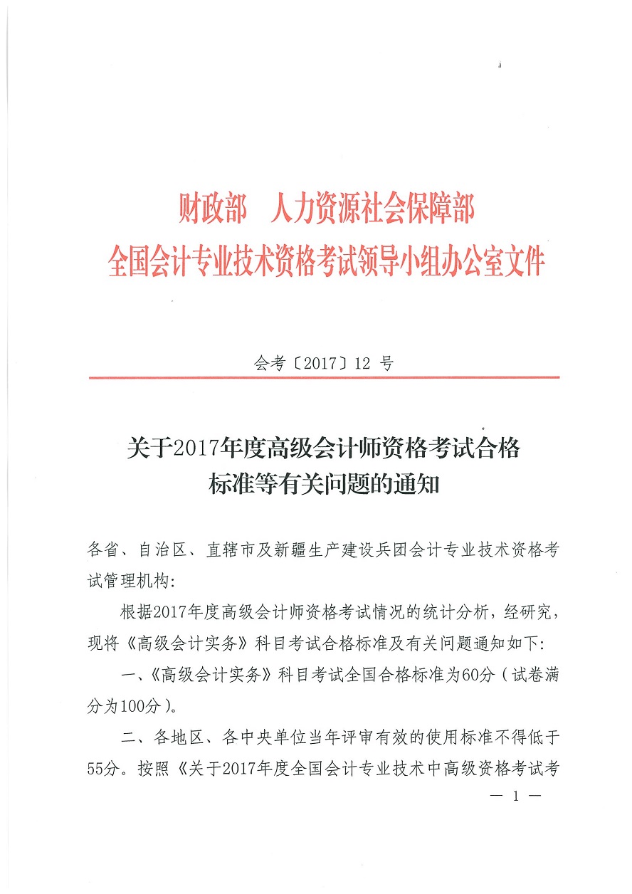 關(guān)于2017年度高級(jí)會(huì)計(jì)師資格考試合格標(biāo)準(zhǔn)等有關(guān)問(wèn)題的通知