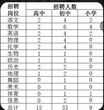 現(xiàn)面向全國招聘小學(xué)和初高中各學(xué)科優(yōu)秀教師,招聘計(jì)劃見下表: